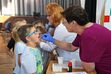Gespannt, was sich in dem „Karies-Tunnel“ befindet, lassen sie sich geduldig ihre Zähne mit einer fluoreszierenden Flüssigkeit von Annette Mend und Martina König bestreichen. Danach dürfen die Kinder hinter den schwarzen Vorhang treten. Der Tunnel ist mit Schwarzlicht beleuchtet und weckt sichtlich das Interesse der kleinen Besucher.