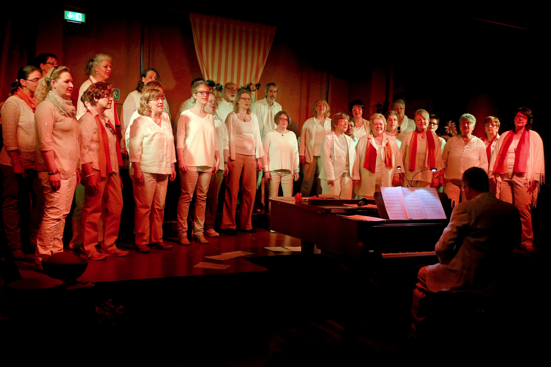 Um dem Publikum das richtige Urlaubsfeeling zu vermitteln, hatten die "Corner Stones" den Saal mit Sonnenschirmen, Sonnenliegen und Sonnensegeln dekoriert. Hinter den Sängern ragte zudem das Segel eines Surfbrettes empor.